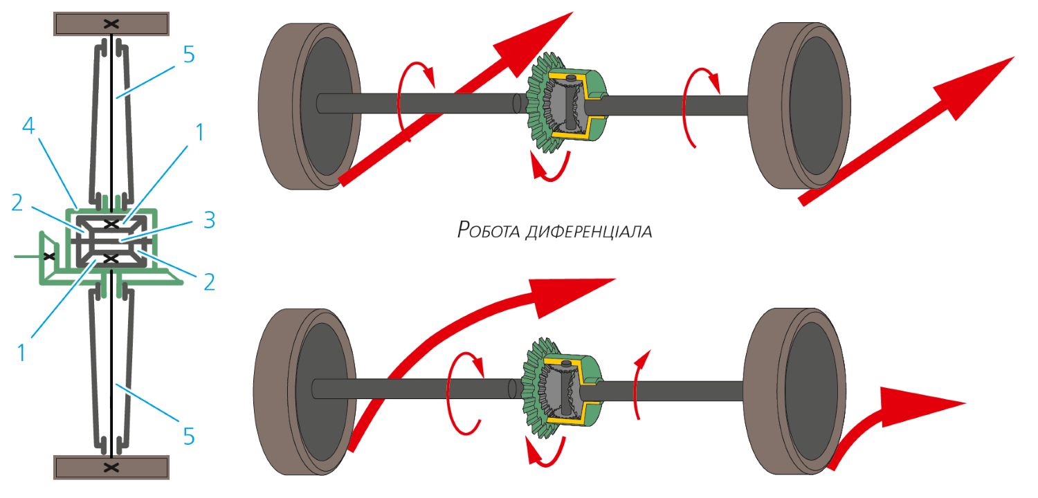 - під час повороту сателіти обертаються навколо своєї осі, внаслідок чого зовнішнє колесо крутиться швидше, а внутрішнє — повільніше;