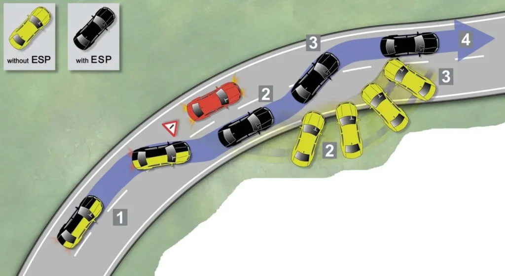 Як ESP допомагає у життєвих ситуаціях? Наприклад, коли авто різко входить у поворот або ковзає на мокрому покритті, ESP втручається і стабілізує машину.